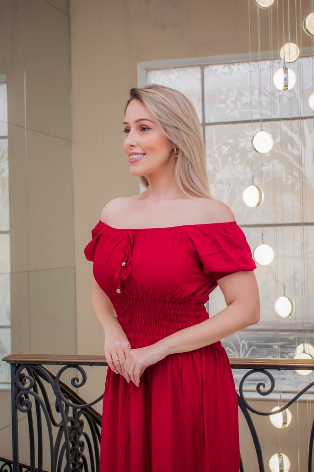 Ele veste do 36 ao 46 por causa do lástex na cintura e tem um caimento maravilhoso, podendo ser usado ombro a ombro ou cobrindo os ombros. Possui decote com elástico, mangas curtas e saia duas marias que garante uma ótima fluidez na peça.